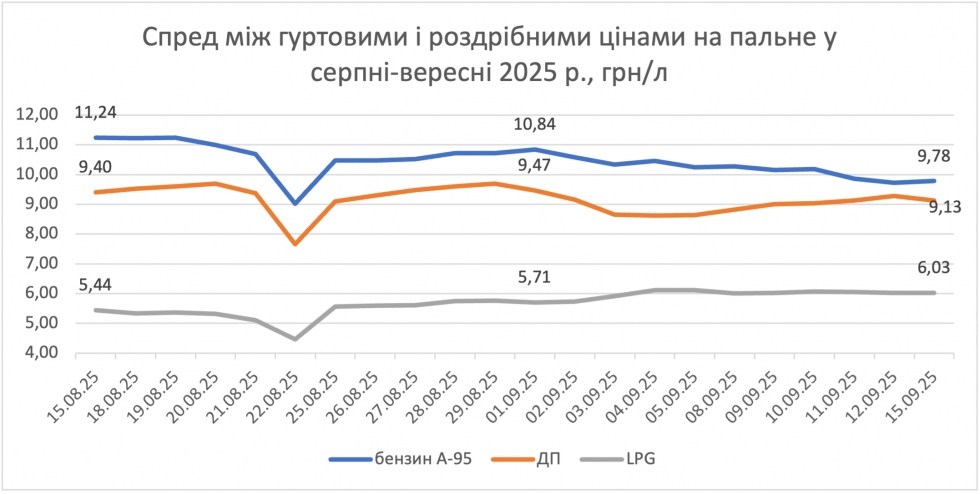 Проте тішили націнки. Станом на 15 вересня для бензинів спред між гуртом і роздробом становив 9,8 грн/л (-1,06 грн/л до показників початку місяця), для дизелю - 9,13 грн/л (-0,34 грн/л), для LPG - 6,03 грн/л (+0,32 грн/л). Можна жити.