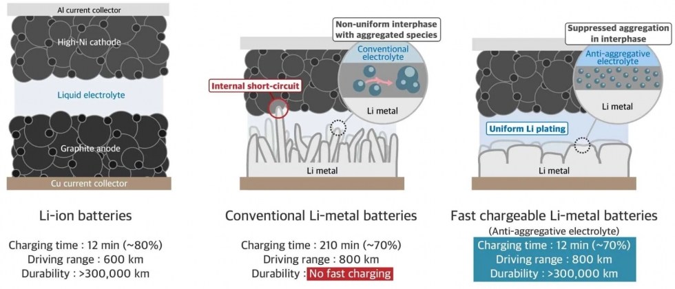 Сьогодні літій-іонні елементи живлення в електрокарах майже досягли своєї межі. Їхня ємність обмежена графітовим анодом - експерти провели аналогію із забитим «готелем», де для іонів літію не вистачає «номерів». Літій-металеві батареї (LMB) обіцяють кратно підвищену щільність енергії за рахунок застосування анода з чистого літію. Але у них є прикрий мінус: під час швидкого заряджання на аноді утворюються дендрити - голчасті нарости, які можуть призвести до короткого замикання і загоряння.
