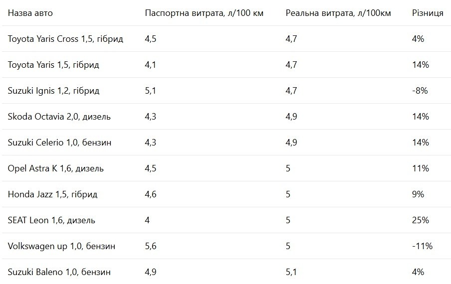 У більшості автомобілів витрата пального на стенді виявилася більша за паспортні показники, проте Volkswagen up та Suzuki Ignis у тесті були економічнішими.