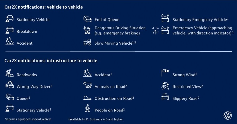 Підключення до мережі може зробити керування автомобілем безпечнішим, зручнішим та ефективнішим. Тому виробництво понад двох мільйонів моделей Volkswagen з Car2X для Європи є важливим кроком до зменшення кількості дорожньо-транспортних пригод. Автомобілі, об'єднані в мережу через Car2X, використовують принцип локального ройового інтелекту та можуть спілкуватися як один з одним, так і з місцевою дорожньою інфраструктурою в режимі реального часу. У критичних ситуаціях система попередження про небезпеку дорожнього руху може відображати попереджувальне повідомлення на цифровій панелі приладів для пасажирів автомобіля. Система доступна в численних моделях Volkswagen - частково в стандартній комплектації, частково як додаткове обладнання.