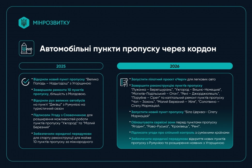 У 2025 році Мінрозвитку та Агентство відновлення за підтримки міжнародних партнерів продовжило розвиток прикордонної інфраструктури. Серед основних результатів: