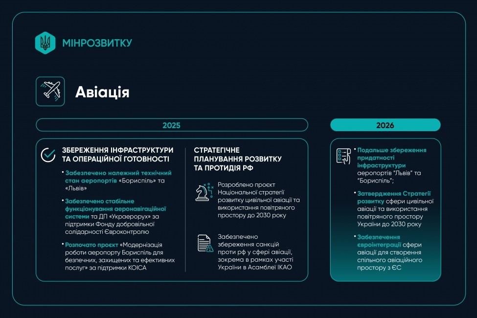 У наступному році Мінрозвитку зосередиться на подальшому збереження придатності інфраструктури аеропортів, затвердженні Стратегії розвитку сфери цивільної авіації та використання повітряного простору України до 2030 року та забезпеченні євроінтеграції сфери авіації для створення в майбутньому спільного авіаційного простору з ЄС.